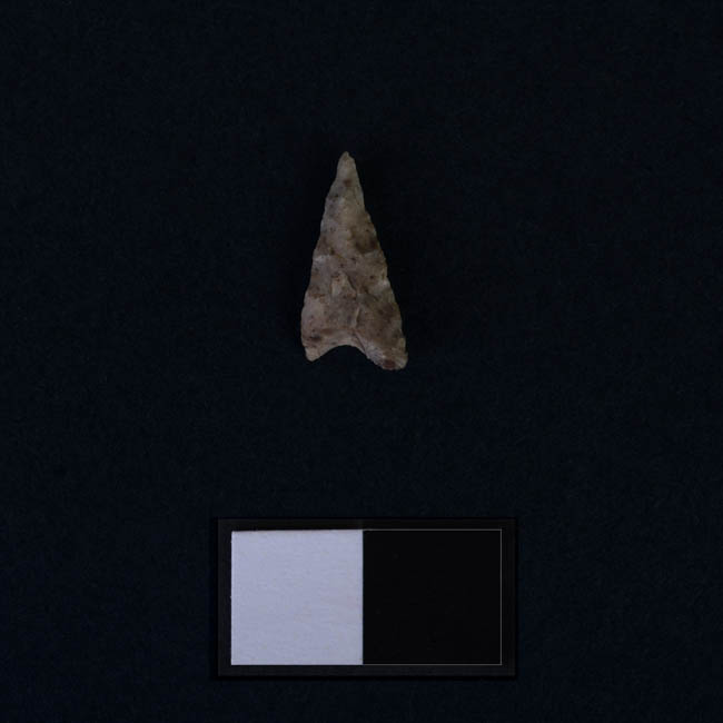 Objeto de uso doméstico de talla bifacial, elaborado en sílice de color blanco con vetas grises. Presenta forma triangular apedunculada, base cóncava con aletas y sección biconvexa.