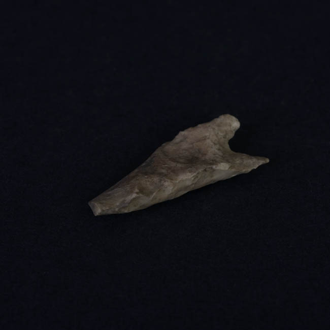 Preforma de instrumento lítico de talla bifacial, elaborado en sílice de color amarillo con vetas grises. Presenta forma triangular y base cóncava. Posiblemente fue fabricada por un tallador inexperto.
