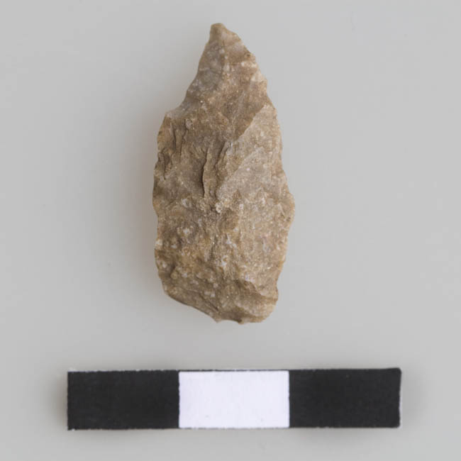 Objeto de uso doméstico de talla bifacial, elaborado en sílice de color café claro de forma lanceolada apedunculada, de base recta y sección biconvexa.