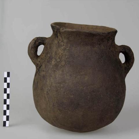 Contenedor de uso doméstico de forma simétrica, restringido con cuello y de perfil inflectado. Presenta cuerpo ovoide invertido, cuello hiperboloide, base plana-convexa, borde evertido y labio plano. Tiene un par de asas tipo circular, de sección circular y emplazadas verticalmente en el cuello. El tratamiento de superficie es café alisado tanto por exterior como por interior. También es posible apreciar huellas de uso por exposición al fuego con hollín en el cuerpo, abrasión general con exposición de antiplásticos en el cuello y base, así como raspados y descascarados en el tercio inferior del cuerpo.