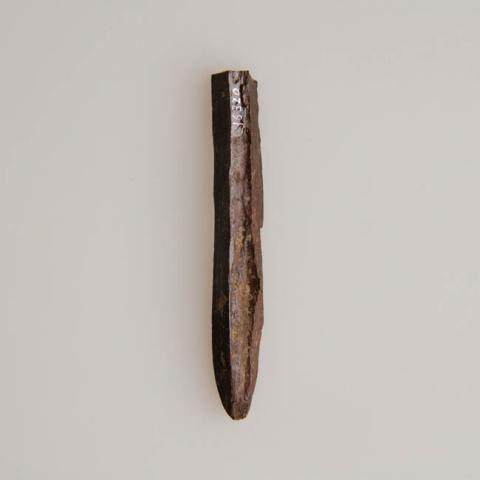 Instrumento óseo aguzado de sección transversal subrectangular, elaborado a partir de diáfisis de hueso largo. Su superficie se observa carbonizada, exhibiendo un color café oscuro a negro, y muy pulida, posiblemente debido a un intenso uso.