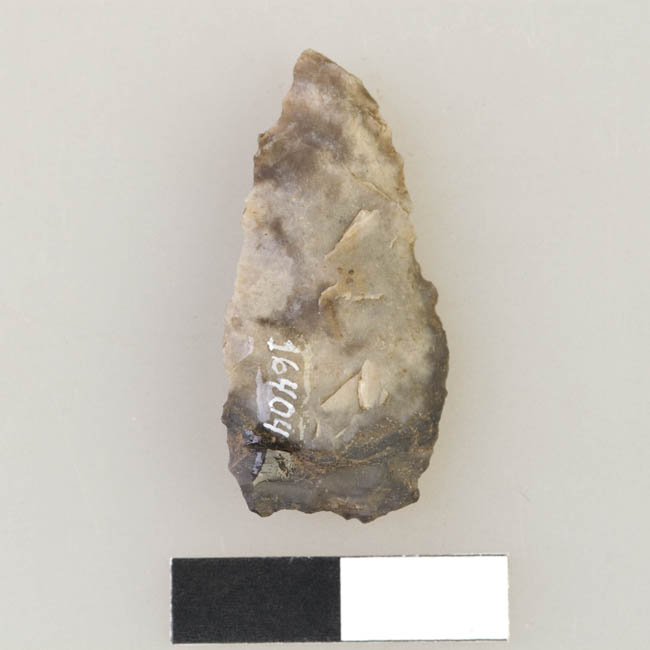 Objeto de uso doméstico de talla bifacial, elaborado en sílice de color verde oscuro de forma lanceolada apedunculada, de base recta y sección biconvexa.