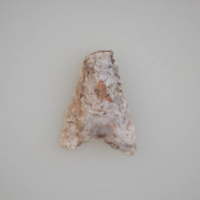 Objeto de uso doméstico de talla bifacial, elaborado en sílice de color gris claro con vetas de color café, de forma triangular apedunculada, de base escotada con aletas y sección biconvexa. Presenta tratamiento térmico.