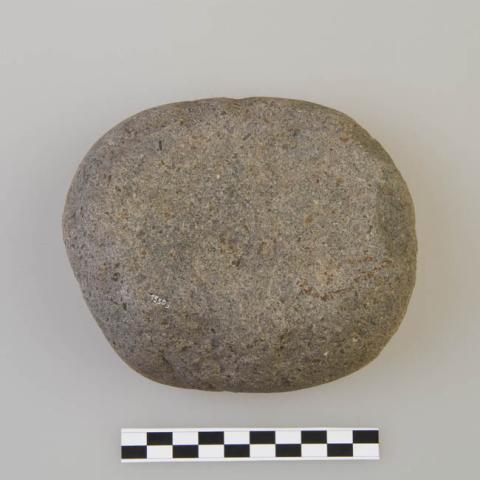 Objeto de uso doméstico, elaborado sobre un guijarro subrectangular de andesita de color café. Presenta dos superficies pulidas de perfil plano. El borde perimetral se encuentra triturado.