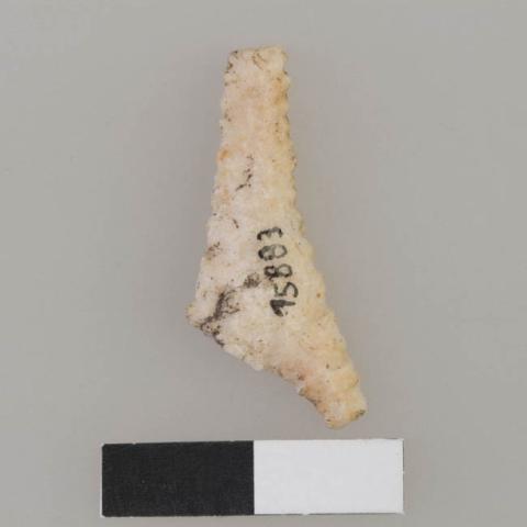 Objeto de uso doméstico de talla bifacial elaborado en sílice opaco de color blanco, de forma triangular apedunculada, base escotada con aletas y sección transversal biconvexa.