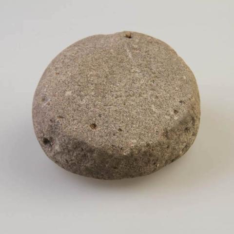 Objeto de uso doméstico, elaborado sobre un guijarro ovoidal de andesita de color gris claro. Presenta dos superficies pulidas de perfil plano, una de ellas se encuentra. triturada. El borde perimetral se encuentra triturado y alisado.