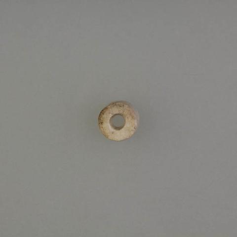 Objeto ornamental de uso personal elaborado en piedra talcosa de color blanco, forma discoidal y sección transversal plana. Presenta una perforación central cilíndrica. Se observa espesor irregular.