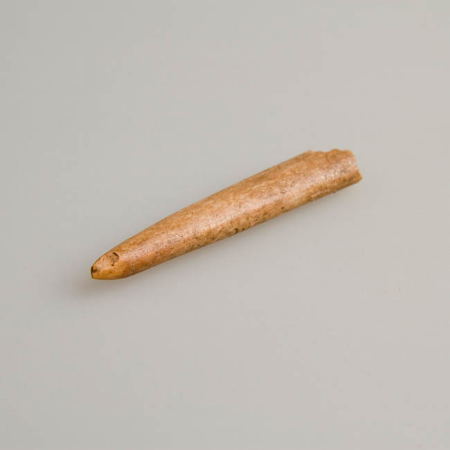 Instrumento óseo aguzado de sección transversal plano-convexa, elaborado sobre hueso largo. Su superficie se presenta pulida, observándose estrías de pulimento longitudinales dispuestas de forma paralela.