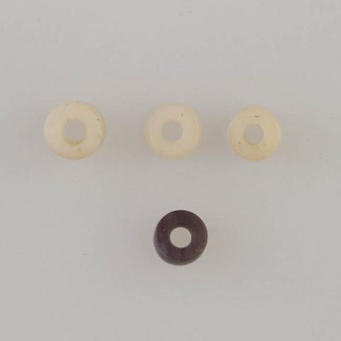 Objetos ornamentales de uso personal, elaborados en piedra, de morfología discoidal y sección transversal plana. Se observa una negra y tres blancas, todas con perforación central cilíndrica.