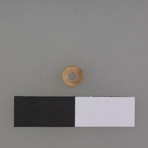 Objeto ornamental de uso personal elaborado en piedra talcosa de color café claro. Forma discoidal y sección transversal plana. Presenta una perforación central cilíndrica.
