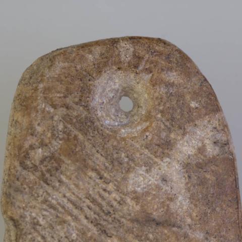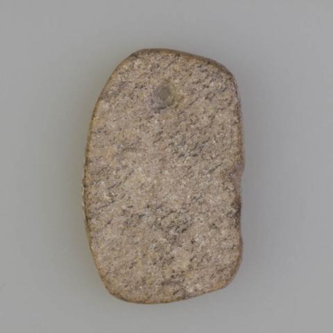 Objeto ornamental de uso personal elaborado en piedra talcosa de color café claro, de forma trapezoidal, bordes redondeados y sección plana. Presenta una perforación bicónica ubicada en la parte superior. Se observan estrías paralelas oblicuas por una de las caras, mientras que la cara opuesta se observa totalmente pulida.