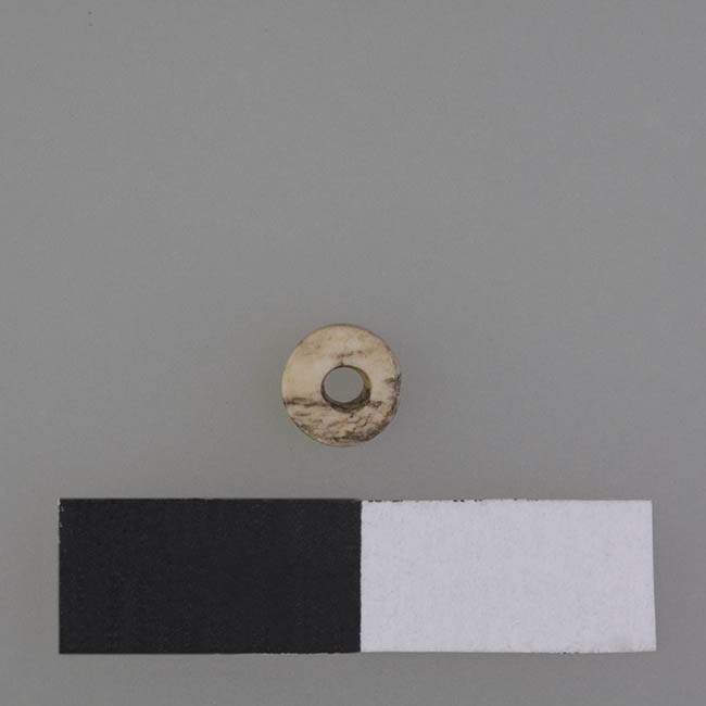 Objeto ornamental de uso personal elaborado en piedra talcosa de color blanco con vetas grises, forma discoidal y sección transversal plana. Presenta una perforación central cilíndrica.