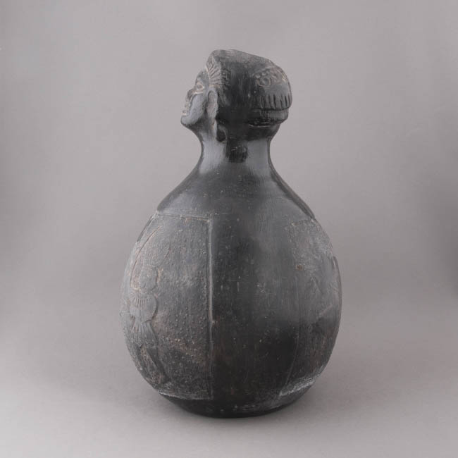 Contenedor de uso doméstico de forma simétrica, restringida con cuello y perfil complejo. Presenta cuerpo ovoide, base plana, cuello cilíndrico, borde invertido y labio aguzado. El tratamiento de superficie es bruñido en negro, presenta un diseño decorativo complejo: modelado e inciso antropomorfo en cuello y en el cuerpo, grabado y bajo relieve de motivo floral y bélico. También es posible apreciar huellas de uso relativas a erosión de modo heterogéneo en parte del cuerpo y base.