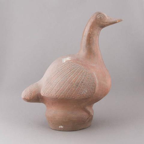 Contenedor de uso doméstico de forma simétrica, restringida con cuello y perfil complejo. Presenta cuerpo ovoide, base plana, cuello cilíndrico, borde invertido y labio aguzado. El tratamiento de superficie es pulido, presenta un diseño decorativo complejo: modelado e inciso ornitomorfo ganzo facial, cola y alas. También es posible apreciar huellas de uso relativas a erosión de modo heterogéneo en parte del cuerpo y base.