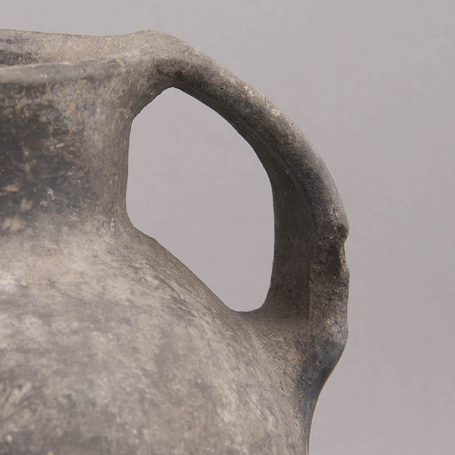 Contenedor de uso doméstico, de forma simétrica, restringido con cuello y de perfil inflectado. Presenta cuerpo esférico, cuello hiperboloide, base plana, borde recto y labio redondeado. Tiene una asa cinta con emplazamiento labio-cuerpo. El tratamiento de superficie es negro pulido exterior y café pulido al interior del cuello y alisado en el cuerpo interior, posiblemente posee ahumado por cocción. Presenta hollín en gran parte del cuerpo, microastillamiento por uso en el borde y huellas de erosión por uso en la base.