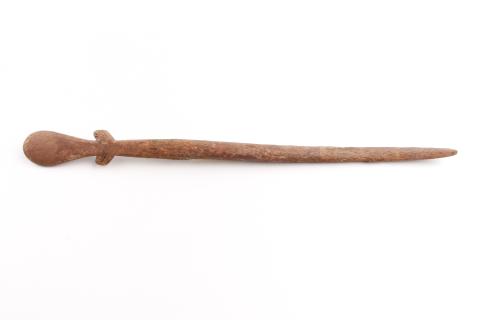 Artefacto de hueso largo de mamífero terrestre, de bordes semiparalelos que siguen la curvatura natural del hueso y que convergen en el extremo proximal en punta aguzada. Es de sección ovoidal a circular y de perfil curvo. El extremo distal tiene forma ovoide y posee una semiconcavidad en forma de pala que se adelgaza hacia el sector medial formando un acanalado. En ese sector presenta un tallado que consiste en dos protuberancias redondeadas que se espejan, con tallados formando bocas con dientes y ojos. La superficie está pulida y es de color café amarillento. Pieza asociada al Individuo 82 (adulto) junto a otra espátula.