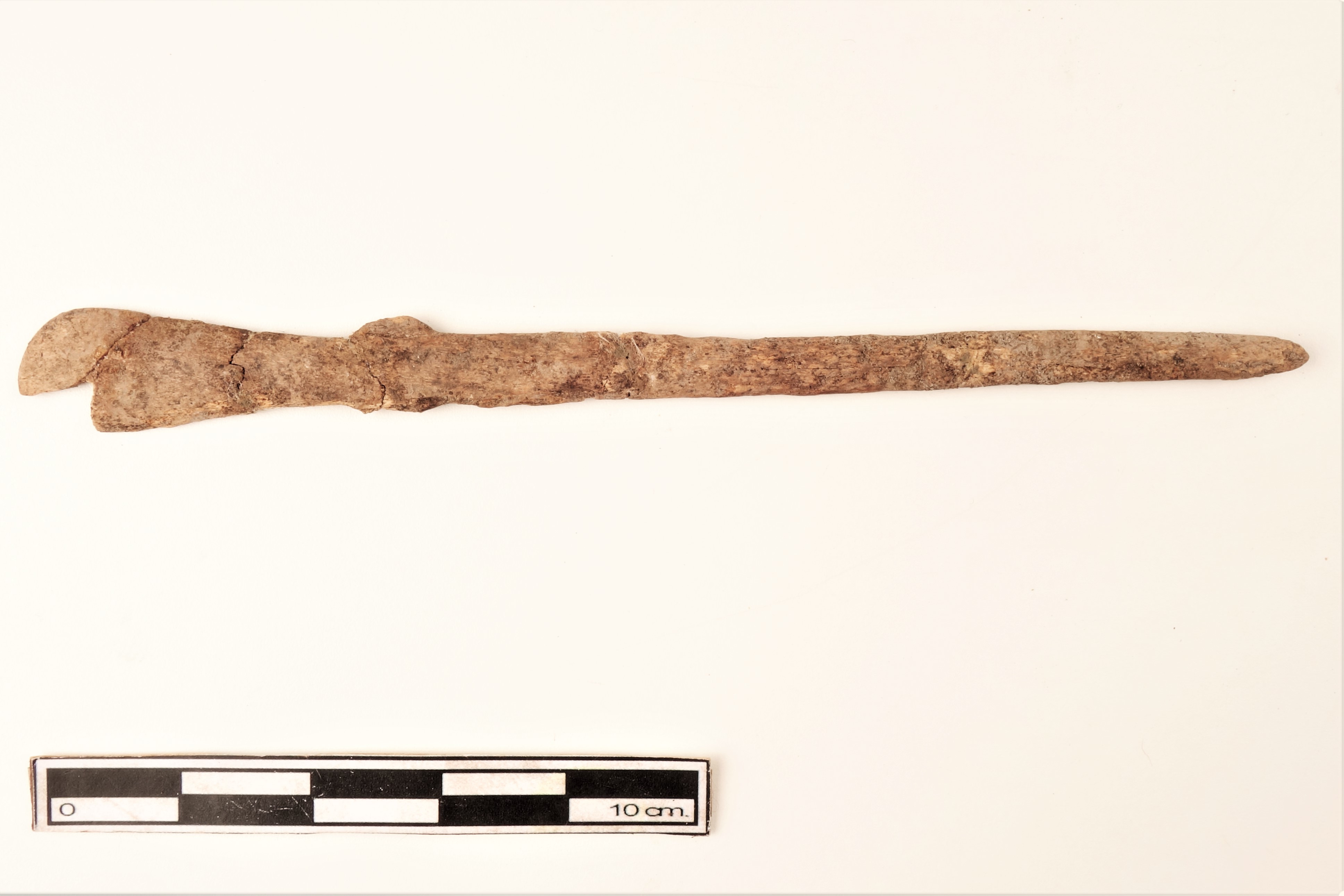 Artefacto de bordes semiparalelos que convergen en el extremo proximal de punta aguzada. Posee una semiconcavidad a modo de paleta en el extremo distal flanqueada por dos protuberancias semicirculares. El mango largo y delgado es de sección plana y presenta perfil recto. La superficie del artefacto es alisada y se encuentra muy erosionada. Pieza manufacturada a partir de la talla de un hueso largo de mamífero terrestre. Fue encontrado junto al Individuo 122 (adulto), específicamente en su muñeca izquierda, sobre una valva de loco.