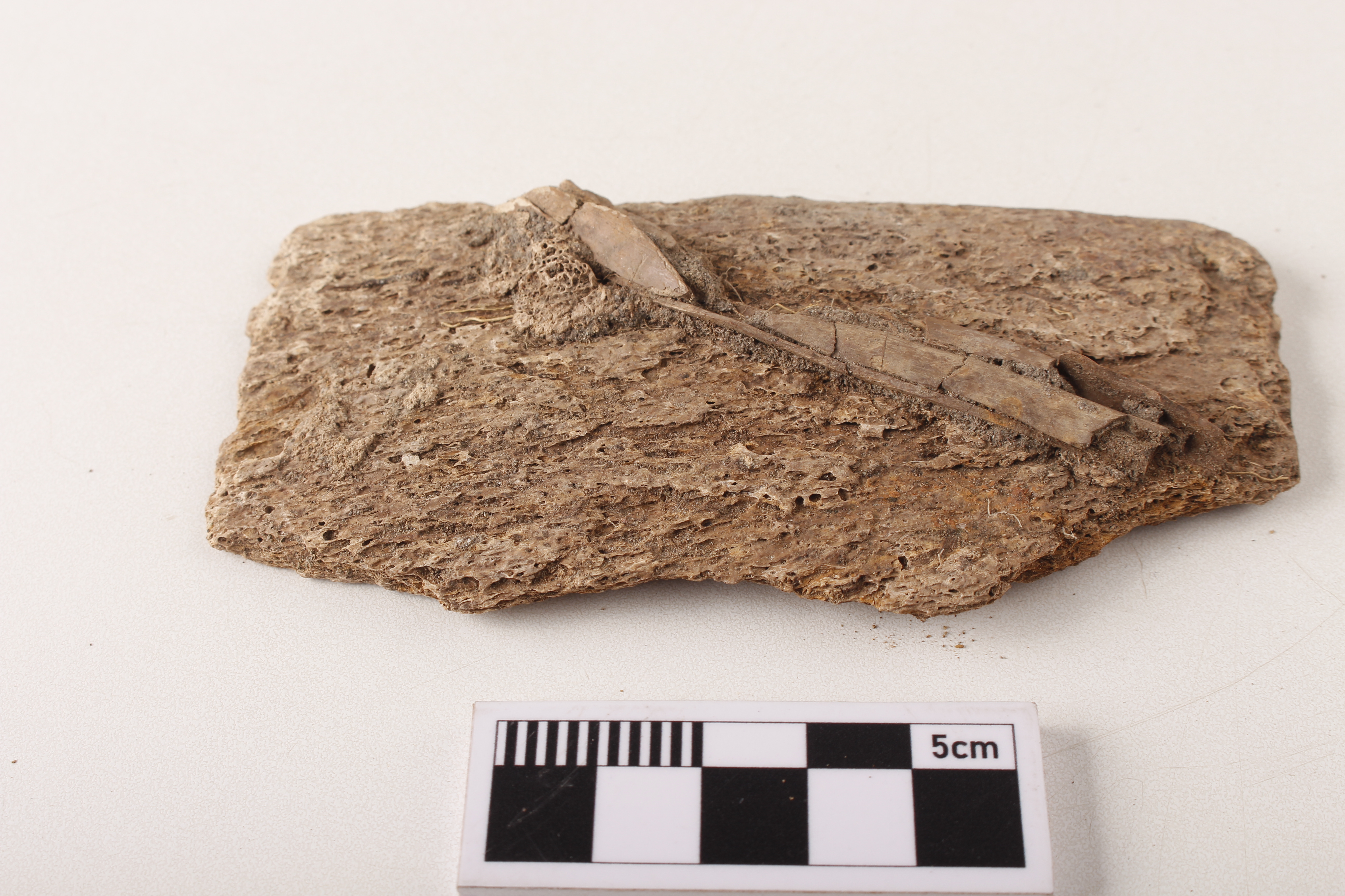 Artefacto óseo indeterminado de forma rectangular, perfil plano y bordes redondeados tipo tableta. Sobre la cara anterior se encuentra un tubo fragmentado de ave pulido que podría corresponder a un instrumento inhalatorio. Ambos poseen una superficie de color amarillo con una coloración en tonos café. Forma parte de la ofrenda 2 asociada al individuo 40 (adulto).
