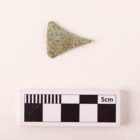 Artefacto fabricado sobre una aleación de cobre-estaño, de forma triangular con una ligera concavidad en sus lados y que presenta un espesor bastante delgado. Posee un extremo más ancho con un leve filo.