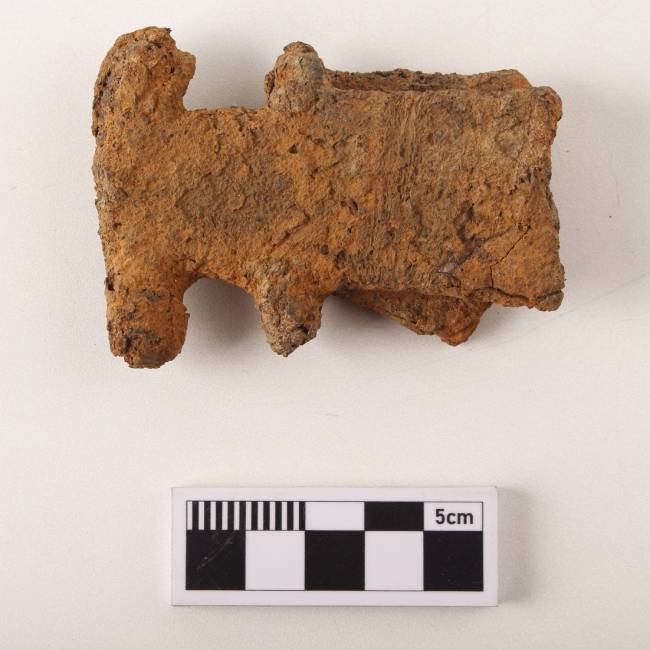 Pieza metálica fabricada sobre cobre o aleación base cobre, de cuerpo rectangular rematada con dos salientes laterales rectangulares bajo los cuales se ubican dos apéndices mamelonares que surgen a ambos lados del cuerpo. Este ejemplar tiene una fractura intencional transversal en su tercio inferior, que generando dos secciones que fueron depositadas una sobre otra, las que actualmente están adheridas entre sí por la corrosión que cubre su superficie. Asociada a los camélidos 14 (adulto) y 21 (feto) en la fosa del individuo 69, adulto probablemente masculino.