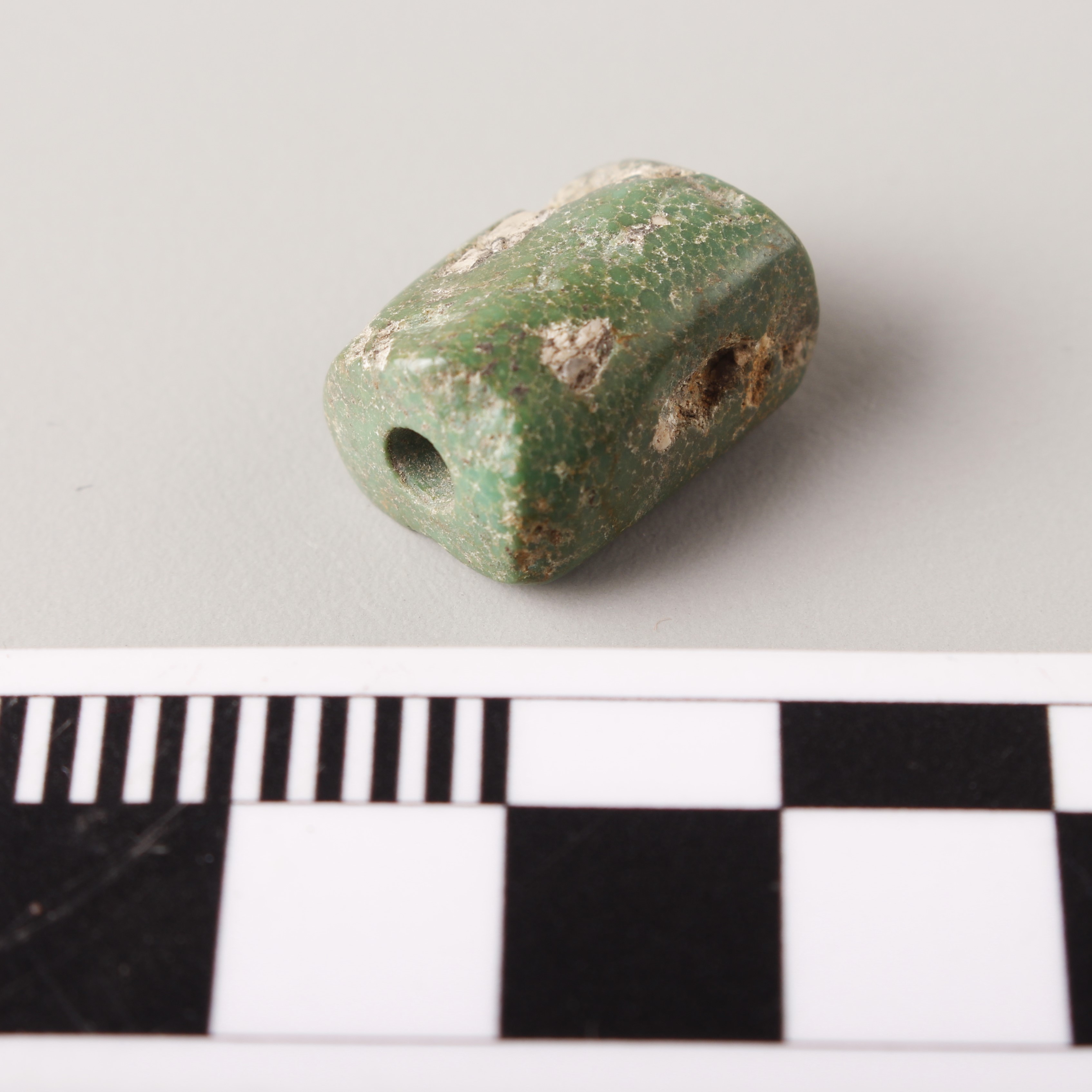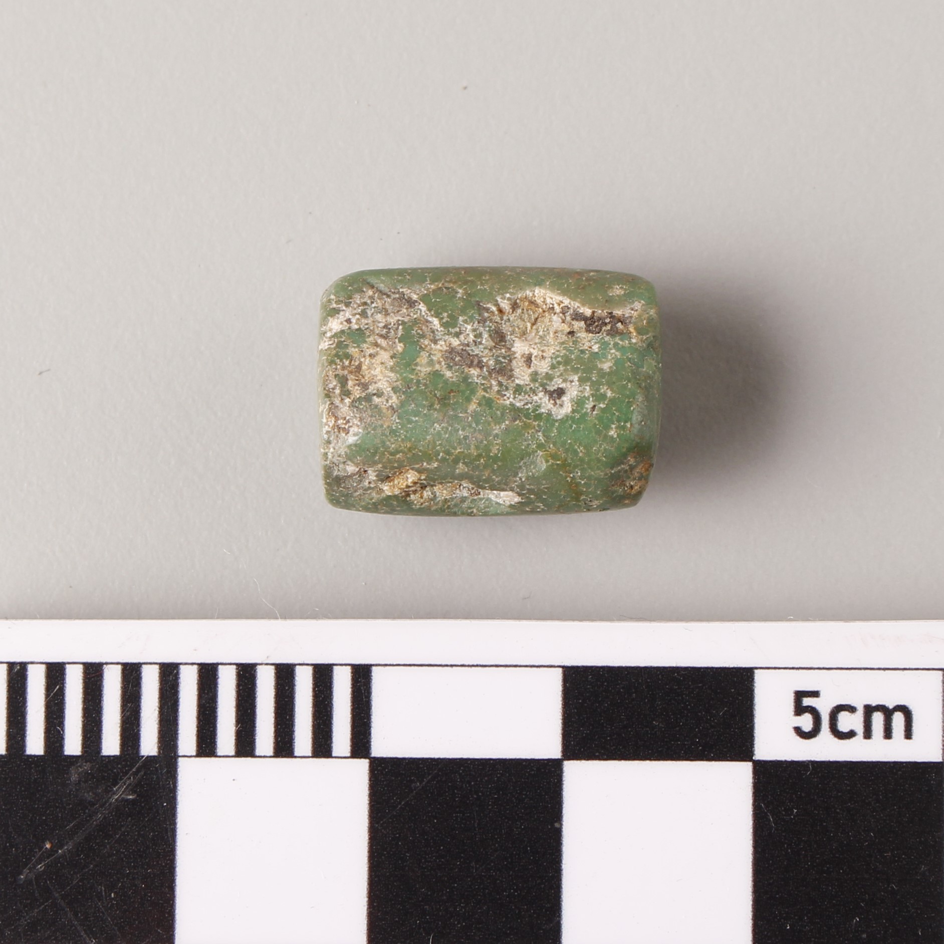 Cuenta lítica cilíndrica de color verde oscuro, de sección tendiente a ovoidal, con sección transversal plana y una perforación central cilíndrica. Superficie pulida. Asociada al Individuo 12 (infante). La cuenta se encontraba junto a cuenta zoomorfa metálica (n° de registro 8-1430) cerca del cuello.