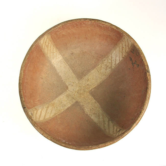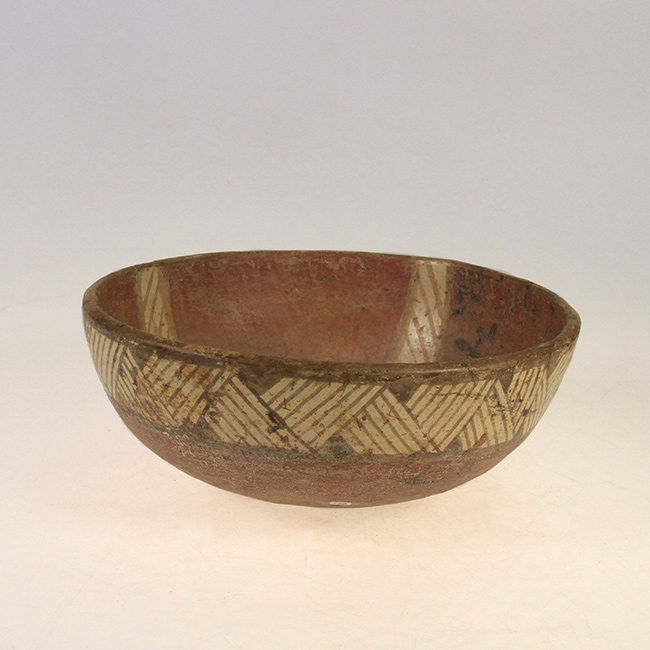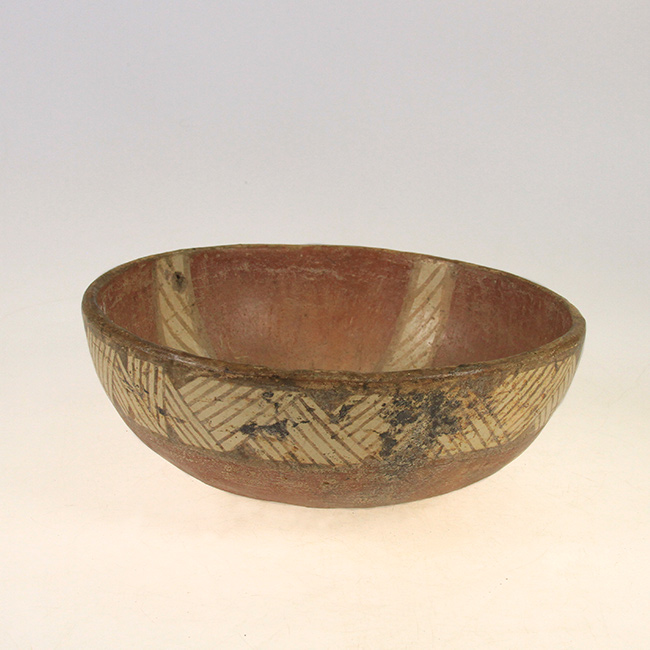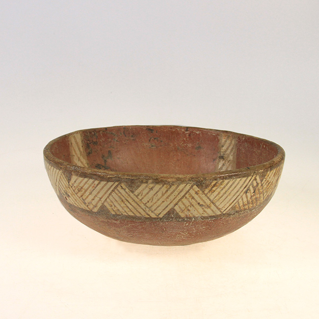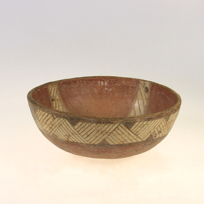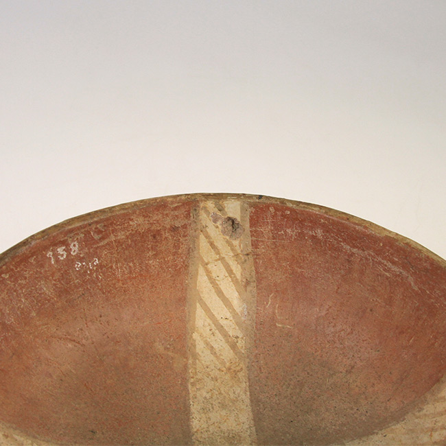 Contenedor de uso doméstico, de forma simétrica, no restringida y de perfil simple. Presenta cuerpo semiesférico, base convexa, borde recto-directo y labio plano. El tratamiento de superficie es pulido y pintado en negro sobre blanco y rojo engobado en ambas caras. Se encuentra decorado por exterior con una banda horizontal circunscrita bajo el borde, compuesta de un motivo Zigzag B 2 (sensu González, 2013) de líneas rectas oblicuas, y por interior con cuatro líneas perpendiculares entre sí con motivos inscritos de líneas oblicuas. También es posible apreciar huellas de uso relativas diversos grados de erosión tanto en la superficie exterior como interior en toda la pieza.
