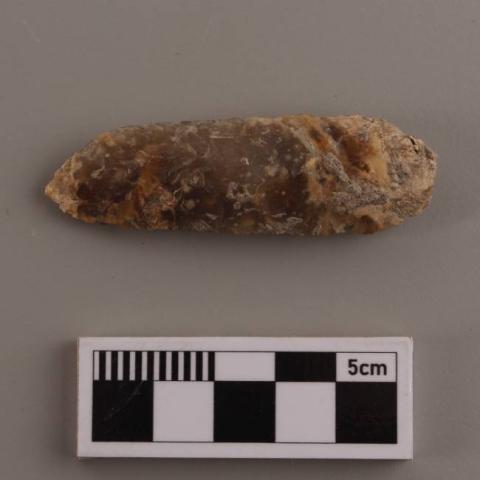 Pieza lítica semi rectangular con un extremo de acabado puntiagudo triangular y otro levemente redondeado. Realizada sobre sílice traslúcido de vetas café grisáceas oscuras y blanquecinas, donde ambas caras fueron talladas (bifacial), dándole un carácter filoso, por lo que corresponde a un elemento cortopunzante. Se encontraba sobre la zona abdominal del individuo 99. Representado en el croquis como "II".
