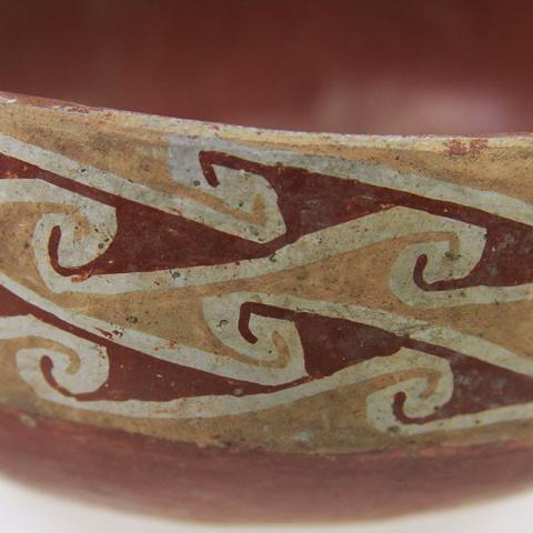 Contenedor de uso doméstico, de forma simétrica, restringida y de perfil simple. Tiene cuerpo semiglobular, base plana-convexa, borde levemente cerrado y labio plano. El tratamiento de superficie pulido en ambas superficies. pintado en blanco y rojo sobre rojo engobado por exterior, y rojo engobado por interior. Se encuentra decorado por una banda horizontal con un diseño complejo de ondas.