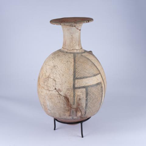 Contenedor de uso doméstico de forma simétrica y restringida con cuello. Borde evertido con dos protúberos a cada lado, labio convexo, cuerpo ovoidal, cuello hiperboloide, base plana, con dos asas vertivales en arco de correa enfrentadas emplazadas en la sección baja del cuerpo. La superficie exterior está pulida y engobada de color blanco de base con decorados de motivos geométricos en color negro y rojo por una de sus caras. Presenta un protúbero frontal en la sección alta de esta cara, previa al cuello. La superficie interior está alisada y es del color natural de la pasta, a excepción del borde que también presenta engobe negro.