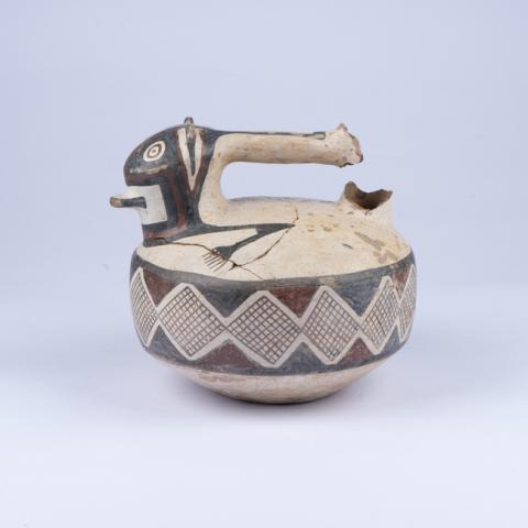 Este último corresponde a un rostro zoomorfo modelado con protúberos adheridos a modo de pico y orejas. Bajo este modelado, se registran dos brazos/patas pintados en el cuerpo. La superficie exterior está pulida y decorada con pintura polícroma sobre engobe blanco con la forma zoomorfa y decorados geométricos de color negro y rojo.