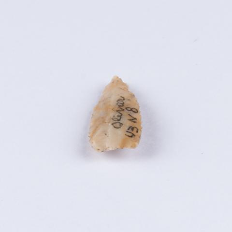 Instrumento lítico usado como cabeza de proyectil arrojadizo durante la caza. Objeto de forma triangular, talla bifacial, retoque bimarginal continuo y base plana. Elaborado en piedra de color blanco y marrón claro opaco.