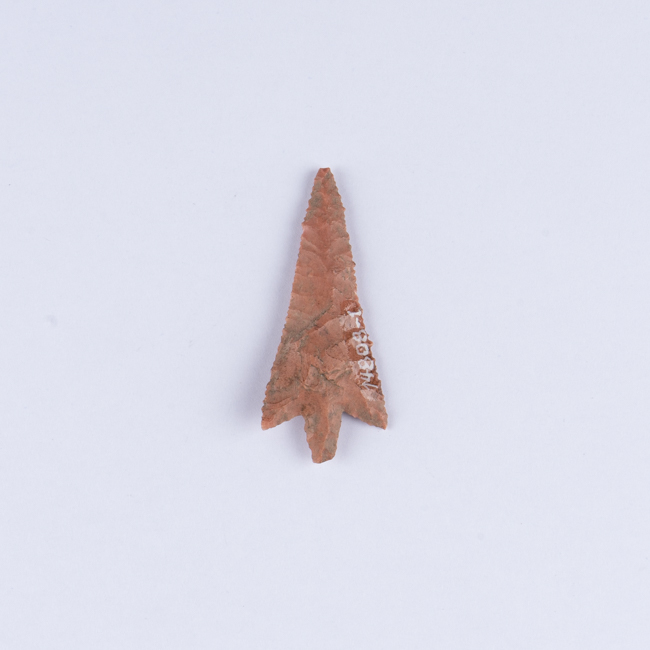 Instrumento lítico utilizada como cabeza de proyectil arrojadizo durante la caza. Tiene cuerpo triangular, hombros apuntados y base pedunculada. Talla bifacial con retoque bimarginal y bordes aserrados. Elaborado en piedra opaca de color anaranjado y marrón.