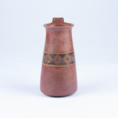 La terminación exterior e interior es alisada y por fuera estña engobada de color rojo con decoración en el centro de la pieza con motivos geométricos en colores negro, rojo y anaranjado.