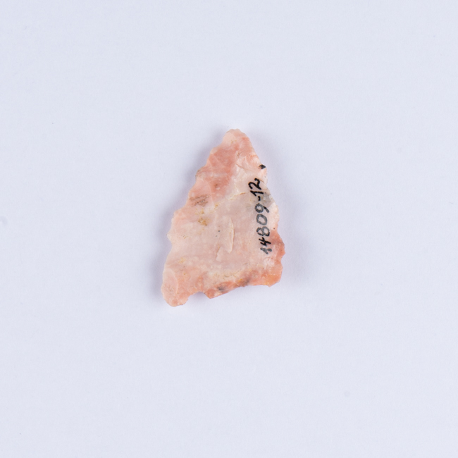 Instrumento lítico usado como cabeza de proyectil arrojadizo durante la caza. Objeto de forma triangular y base fragmentada. Tiene talla bifacial tosca. Está fabricado en piedra de color blanco, rosa y en una capa más profunda, se observa una mancha de color oscuro.