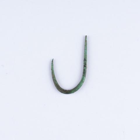 Instrumento metálico usado para pescar. Objeto elaborado en una pieza de metal fundido de forma alargada que se curva en la porción distal. Color marrón con manchas verdes y ocres.