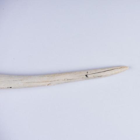 Instrumento óseo aguzado de sección transversal cilíndrica, elaborado sobre fragmento de hueso. El extremo activo se encuentra romo y aguzado, con marcas de pulido y tallado. El extremo proximal mantiene las características naturales del material. Es de color blanco con tintes amarillos.