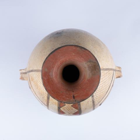 Contenedor de uso doméstico de forma simétrica y restringida con cuello. Borde evertido, labio convexo, cuerpo ovoidal, cuello hiperboloide, base cóncava, con dos asas vertivales en arco de correa enfrentadas emplazadas en la sección baja del cuerpo. La superficie exterior está pulida y engobada de color blanco de base con decorados de motivos geométricos en color negro y rojo por una de sus caras. La superficie interior está alisada y es del color natural de la pasta, a excepción del borde que también presenta engobe negro en el canto y rojo en el interior.
