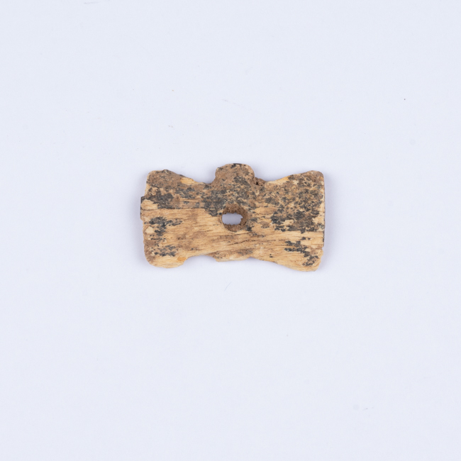 Instrumento usado en conjunto con el huso para fabricar hebra textil elaborado en hueso. Es de forma simétrica, compuesta por un centro rectangular del cual se desprenden dos alas trapezoidales y dos semicírculos en la transversal del centro. Tiene una perforación circular en el centro de la pieza. Es del color natural del material.