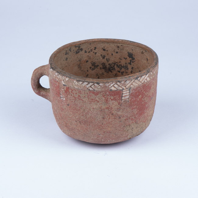 Contenedor no restringido de contorno simple. Tiene asa de inserción vertical, en la sección media superior del cuerpo. Posee una base circular cóncava, cuerpo cilíndrico, de paredes rectas y borde simple levemente evertido. Superficie exterior alisada y engobada de color rojo, negro y blanco representando motivos geométricos.