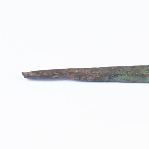 Utensilio para modelar otros materiales. Es de forma alargada y tiene en el extremo distal un borde biselado curvado aguzando la forma hasta el extremo proximal. La superficie es alisada y tiene colores verde, gris y marrón.