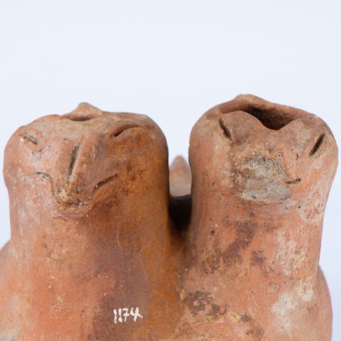 Contenedor de uso doméstico, de forma simétrica, restringido con cuello y de perfil complejo. Presenta cuerpo elipsoide horizontal, cuello cilíndrico, base modelada y doble gollete modelado zoomorfo de borde invertido y labio redondeado. El tratamiento de superficie es liso y se observan las marcas del modelado. Se encuentra compuesto de un modelado zoomorfo constituido de dos cabezas, vértebras, cola y cuatro patas. Elaborado en arcilla de color anaranjado con marcas ahuesadas, marrón y negras.