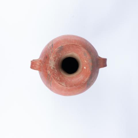 Contenedor de uso doméstico de forma simétrica y restringida con cuello. Borde evertido, labio redondeado, cuerpo ovoidal, cuello hiperboloide, base tronco-cónica, con dos asas verticales en arco de correa enfrentadas emplazadas en la sección media baja del cuerpo. La superficie exterior está pulida y engobada de color rojo de base con decorados de motivos geométricos en color negro.