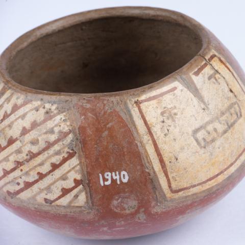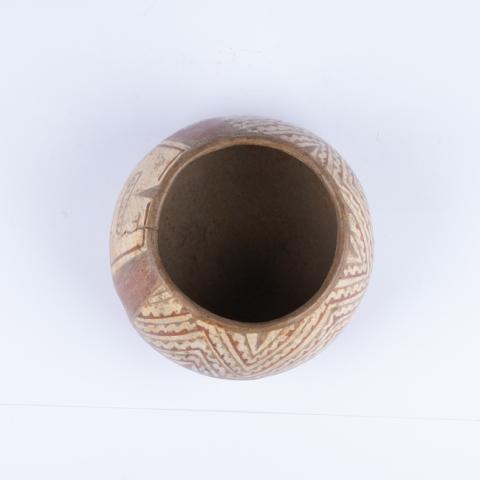 Contenedor de uso doméstico, de forma simétrica, restringida y de perfil compuesto. Tiene cuerpo esférico, base convexa, borde invertido y labio redondeado. La superficie exterior está pulida y engobada con diseños geométricos y representación zoomorfa en colores rojo, blanco y negro. Por el interior es de color marrón natural alisado.