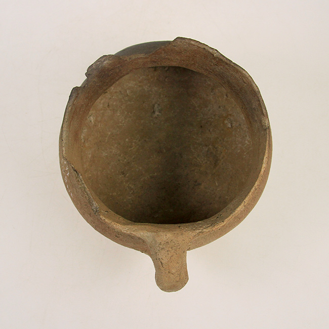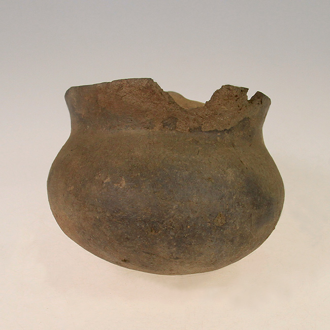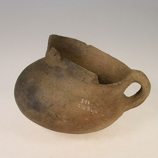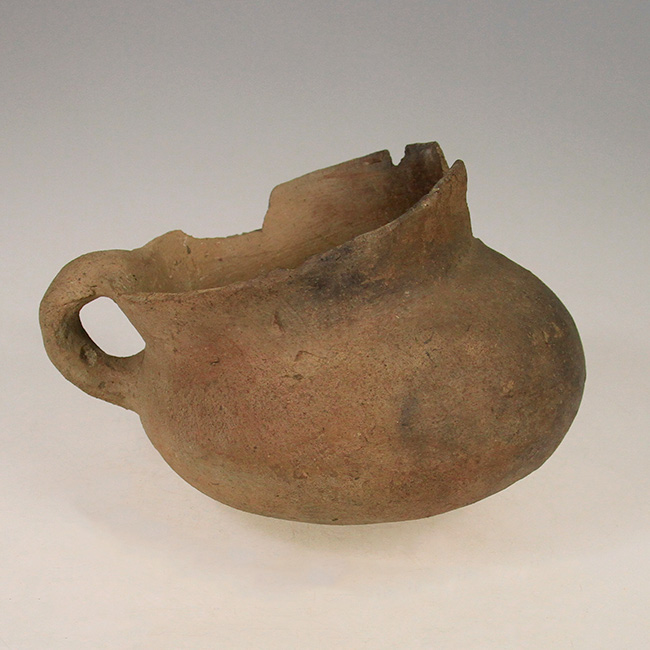 Contenedor de uso doméstico y/o ritual asimétrico, de estructura restringida con cuello y perfil compuesto. Corresponde a una vasija o jarro zapato Diaguita de cuerpo elipsoidal y cuello cónico, de base convexa, borde evertido y asa labioadherida vertical. Su superficie es monocroma alisada color marrón con parches de hollín por exposición directa al fuego.