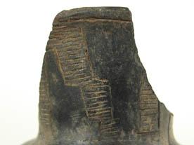 Contenedor de uso doméstico, de forma simétrica, restringido con cuello y de perfil compuesto. Presenta cuerpo ovoide invertido, cuello cónico invertido, base plana levemente cóncava, borde ligeramente evertido y labio redondeado. El tratamiento de superficie es negro bruñido por el exterior y café-negro pulido-alisado por el interior. Considera decoración ahumada en toda la pieza, así como decoración incisa con motivos geométricos formados por bandas escalonadas rellenas por líneas horizontales paralelas en el cuello. También se observa la exposición de antiplásticos por erosión en la base, descascaramiento en el cuerpo y microastillamiento en el borde.