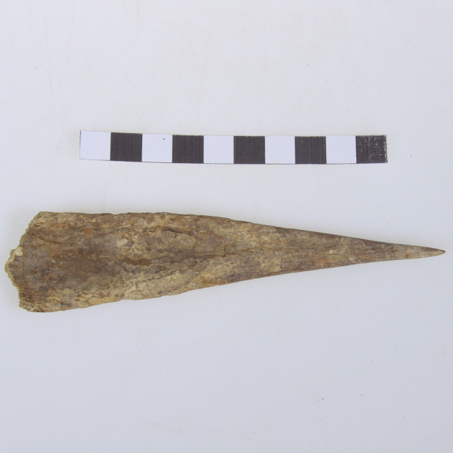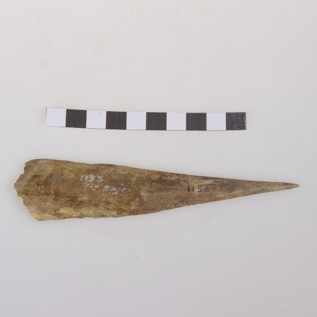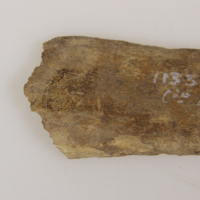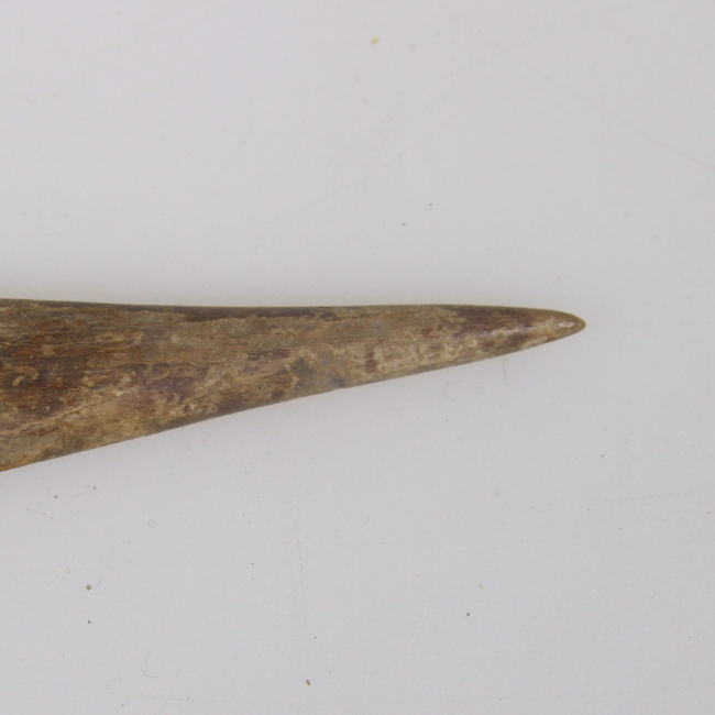 Instrumento óseo de extremo activo aguzado y sección transversal ovalada, elaborado a partir de hueso largo de mamífero. Posible punzón, aparentemente fragmentado en extremo proximal.