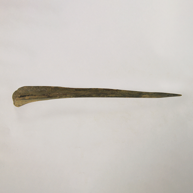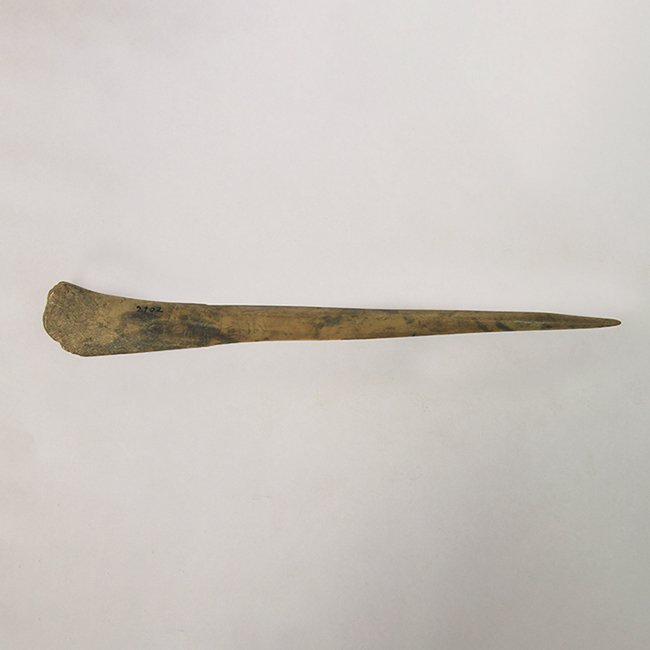 Instrumento óseo de extremo activo aguzado y sección transversal ovalada. Se presenta pulido y quemado. Elaborado en hueso largo de mamífero terrestre.
