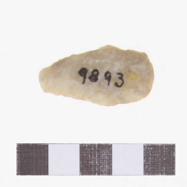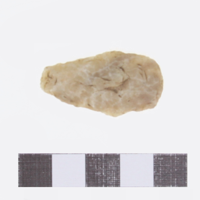 Objeto de uso doméstico de talla bifacial de forma lanceolada, de base curva y sección biconvexa. Elaborado en materia prima de color blanquecino. Presenta ápice fracturado.