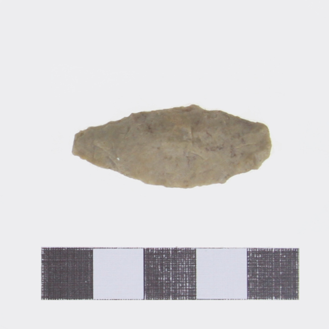 Objeto de uso doméstico de talla bifacial de forma lanceolada, de base apuntada y sección biconvexa. Elaborado en materia prima de color beige. Presenta ápice fracturado.