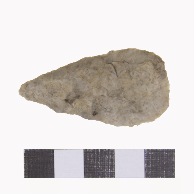 Objeto de uso doméstico de talla bifacial para uso como punta de proyectil, de forma lanceolada y sección biconvexa. Se encuentra elaborado sobre una matriz de color blanquecino.